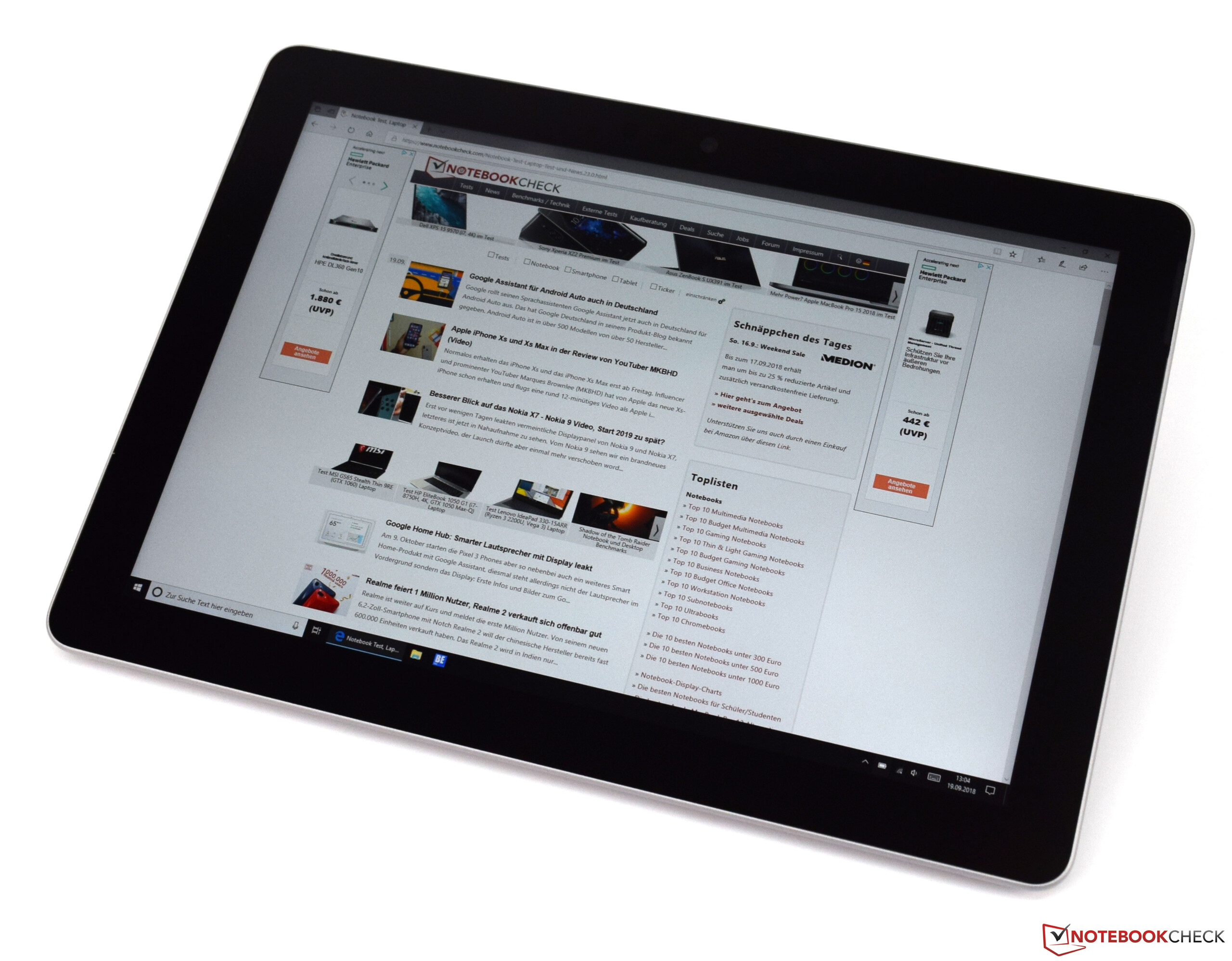 Wer sich für das Microsoft Surface Go entscheidet, sollte bedenken, dass keine Tastatur im Lieferumfang enthalten ist. Somit bietet das Tablet primär nur den Bildschirm als Eingabemedium. Dieser 10-Zoll-Bildschirm im gewohnten 3:2-Format reagiert sehr gut auf Eingaben und Schwenkbewegungen. Ohne lange Wartezeiten rotiert die Darstellung in die Senkrechte und auch wieder zurück in die Waagerechte. Ungenau arbeitende Bereiche haben wir bei unserem Testgerät nicht finden können. Um noch präziser auf dem Touch-Display navigieren zu können, empfehlen wir den optionalen Active Pen oder die Microsoft Mobile Maus.