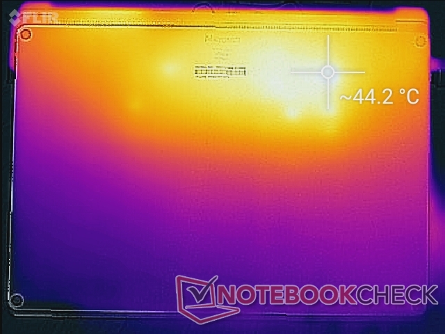 Trotz der Leistungsdifferenz unterscheidet sich die Wärmeentwicklung auf den Oberflächen des Intel- und des AMD-Modells kaum. Während der gleichzeitigen Ausführung von Prime95 und FurMark erreicht das Intel-Gerät stellenweise 41 °C bis 46 °C und das AMD-Gerät 42 °C bis 50 °C. Bei hoher Systemlast wie zum Beispiel im Gaming-Betrieb muss man hier jedoch anders als bei den meisten Gaming-Laptops mit sehr warmen WASD-Tasten rechnen.