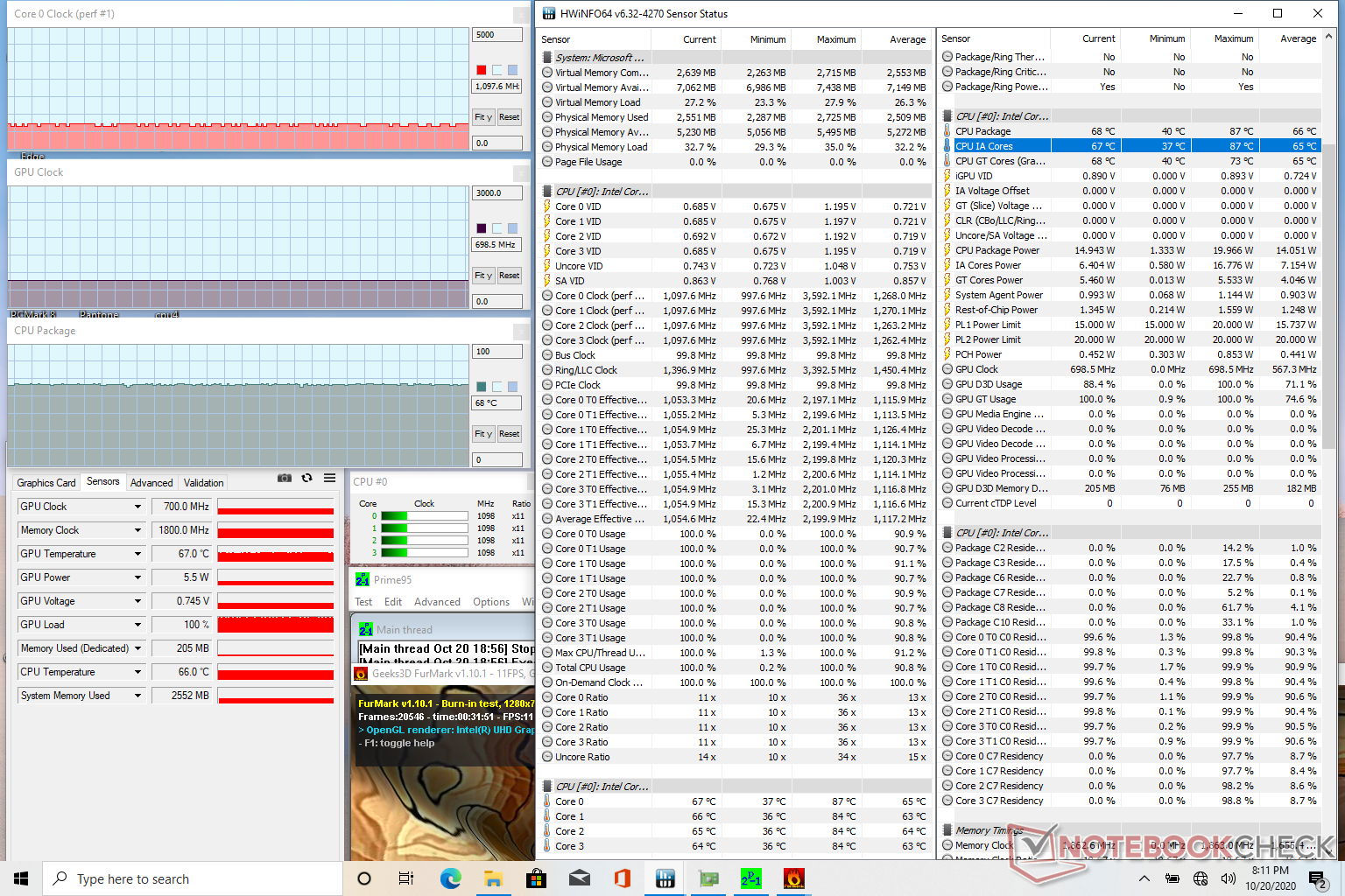 | Prime95 + FurMark Stress | 0.9 - 1.1 | 700 | 68 |