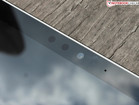 Die Lautsprecheröffnungen befinden sich links und rechts am Chassis, aber an der Frontseite und direkt neben dem schwarzen Display-Rahmen. Sie sind durchaus in der Lage, Musik oder Stimmen laut und sauber wieder zu geben. Von kraftvoll und durchdringend wollen wir aber nicht sprechen, dazu fehlen einfach die ausgeprägten Tiefen und das Raumvolumen. Dennoch ist es bemerkenswert, wie gut Mitten und Höhen von den kleinen Treiben abgebildet werden. Mit guten Laptop-Lautsprechern kann das mithalten, externe Lösungen ersetzt es hingegen nicht.