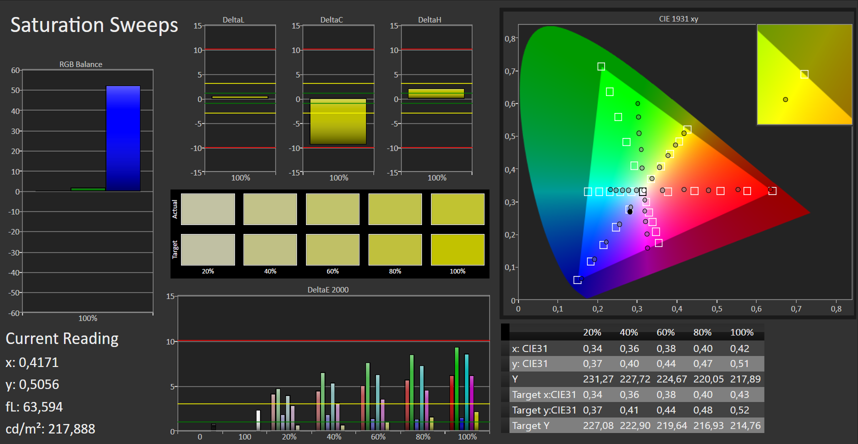 Die Abweichung der Farben und Graustufen fallen, wie von einem hochwertigen IPS zu erwarten ist, sehr gut aus. Die Abdeckung im sRGB-Raumt beträgt 96 % und im großen AdobeRGB-Raum 60 %.