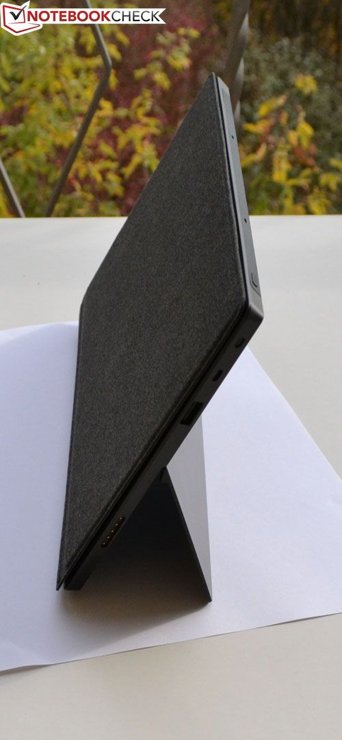 Um dem entgegenzuwirken, hat Microsoft an der Rückseite einen ausklappbaren Kickstand integriert, der dem Tablet einen ordentlichen Stand bietet. Die stabile Konstruktion mit kräftigen Scharnieren macht einen vertrauenserweckenden Eindruck. Man kann das Tablet bedenkenlos am Standfuß festhalten oder anheben. Im geschlossenen Zustand ist der Ständer vollständig im Gehäuse versenkt.