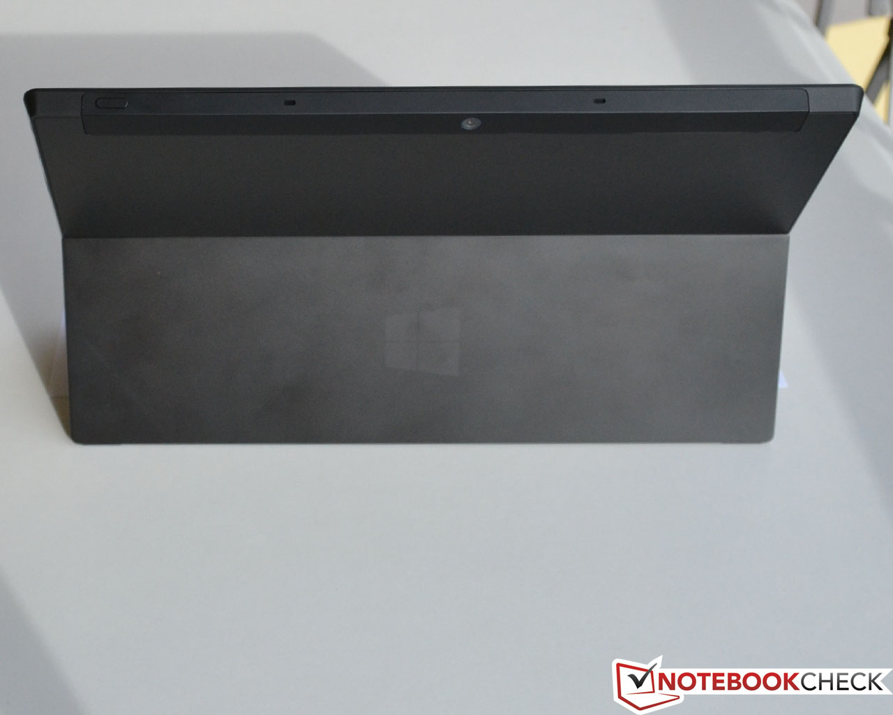 Im Displayrahmen des Microsoft Surface befindet sich die Front-Kamera, die mit 720p auflöst. Das hintere Pendant, ebenfalls mit 720p Auflösung, ist in eine schmale Kunststoffleiste, die sich von der Rückseite über die obere Gehäuse-Kante erstreckt, eingepasst.