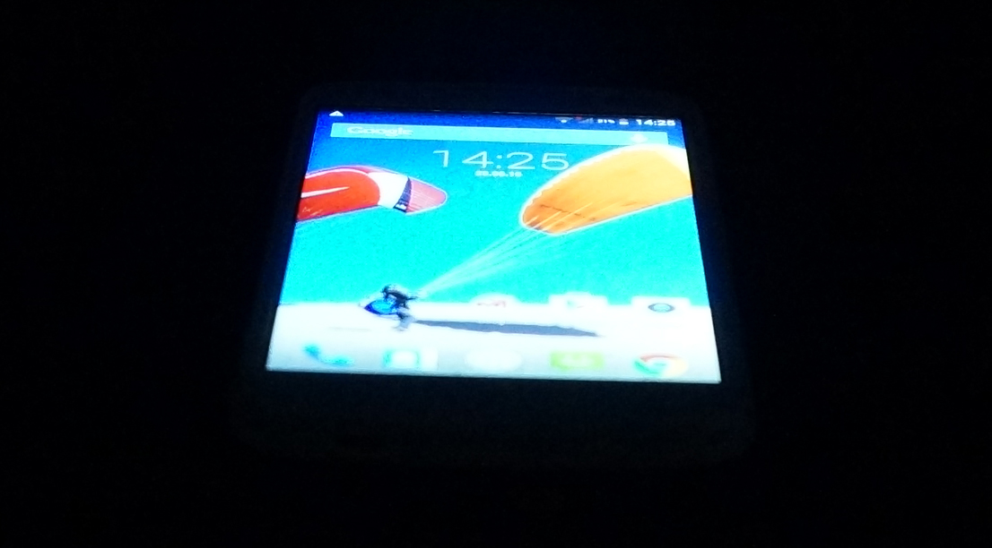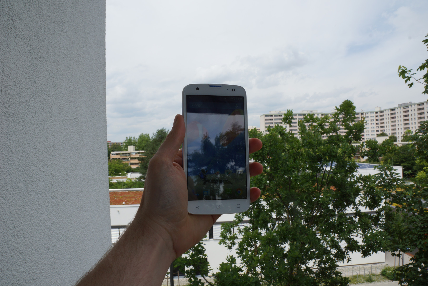 Im Freien schlägt sich das Smartphone weniger gut, was am spiegelnden Bildschirm und der recht geringen Helligkeit liegt. Bei maximalen Helligkeitseinstellungen kann man den Bildschirminhalt aber noch gut erkennen.