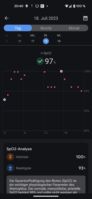 Bei der Messung der Blutsauerstoffsättigung dient ein Braun Pulsoximeter 1 als Referenzgerät. Im Schnitt aus drei Messungen liegt die Abweichung der TicWatch Pro 5 bei 2,78 Prozent. Die Messwerte der Mobvoi-Smartwatch sind in dieser Kategorie jeweils höher als die des Referenzgeräts.