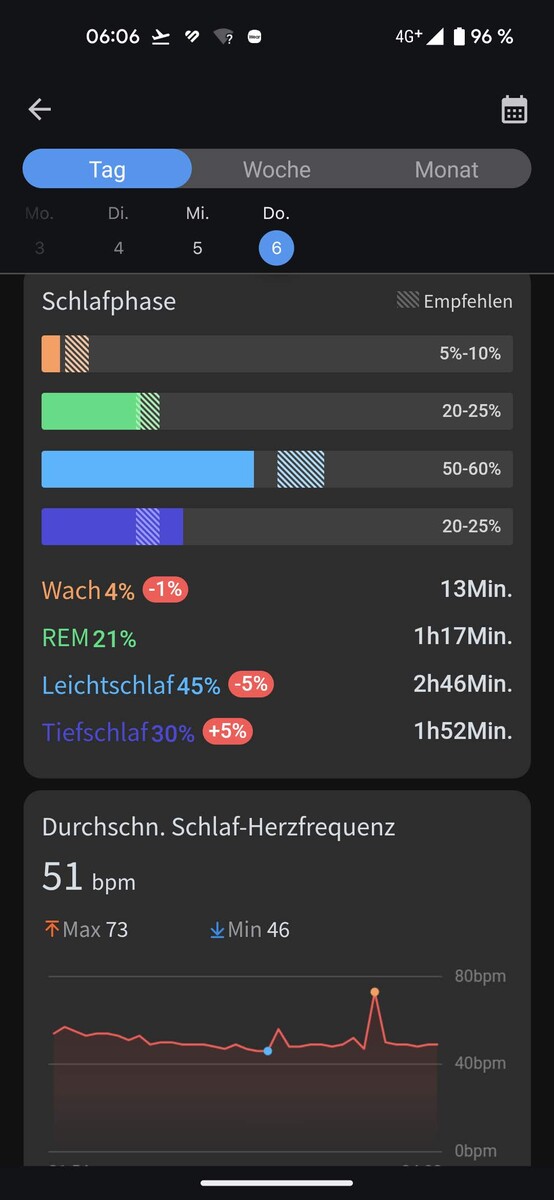 Außerdem informiert die Health App auch über die Herzfrequenz, den Blutsauerstoff, die Atemfrequenz und die Hauttemperatur während des Schlafs. Unabhängig von den Nachtwerten kann die Smartwatch zusätzliche Nickerchen mit eigenen Werten erfassen. Leider nutzt Mobvoi die erhobenen Daten nicht, um einen smarten Wecker anzubieten.