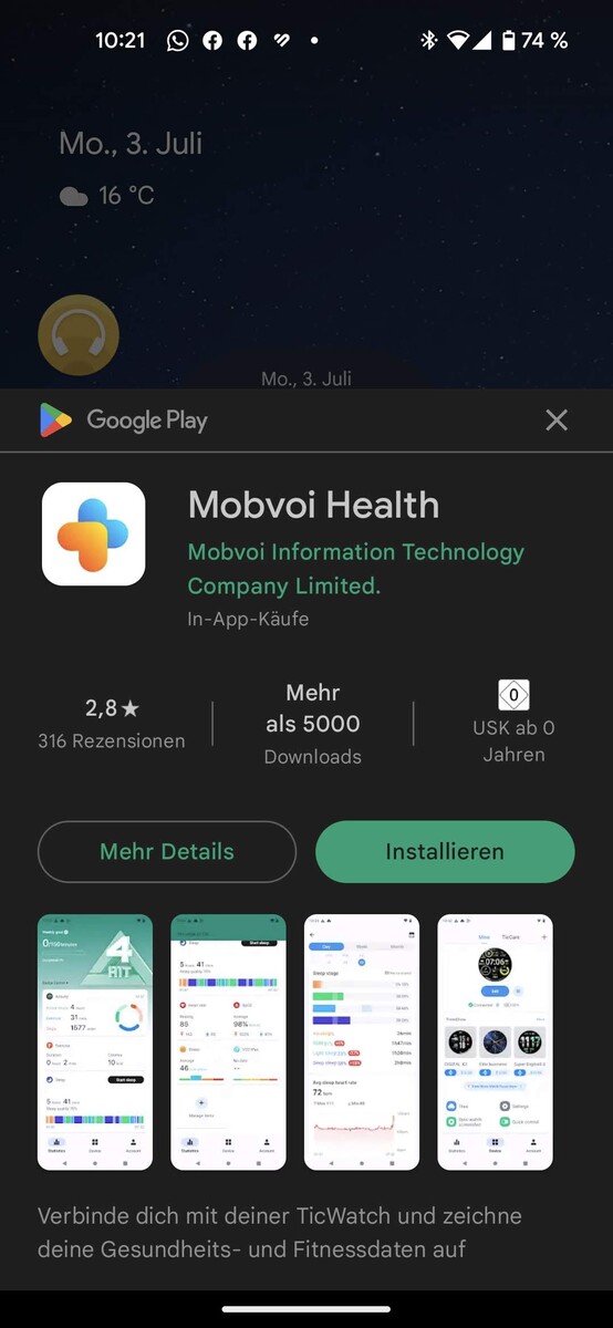 Wird die Mobvoi TicWatch Pro 5 zum ersten mal eingeschaltet, erscheint ein Pop-Up auf einem Android-Smartphone in der Nähe. Darüber ist es möglich, gleich die passende Mobvoi Health App über den Playstore herunterzuladen. Diese Software ist notwendig, um die Smartwatch einzurichten, dort werden außerdem alle Gesundheits- und Trainingsdaten gesammelt.