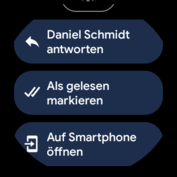 Optisch fällt der breite Rand um das Display herum zumindest bei Wahl eines hellen Zifferblatts unschön auf. Die erwähnte gute Darstellung und Handhabbarkeit der Benachrichtigungen ist dagegen in der Praxis ein Pfund. Selbst wenn man die Antwortmöglichkeit nicht oder nur sehr selten nutzt – dass es prinzipiell möglich ist und im Bedarfsfall dann eben auch unkompliziert funktioniert, ist kein Alleinstellungsmerkmal, aber ein Pluspunkt.