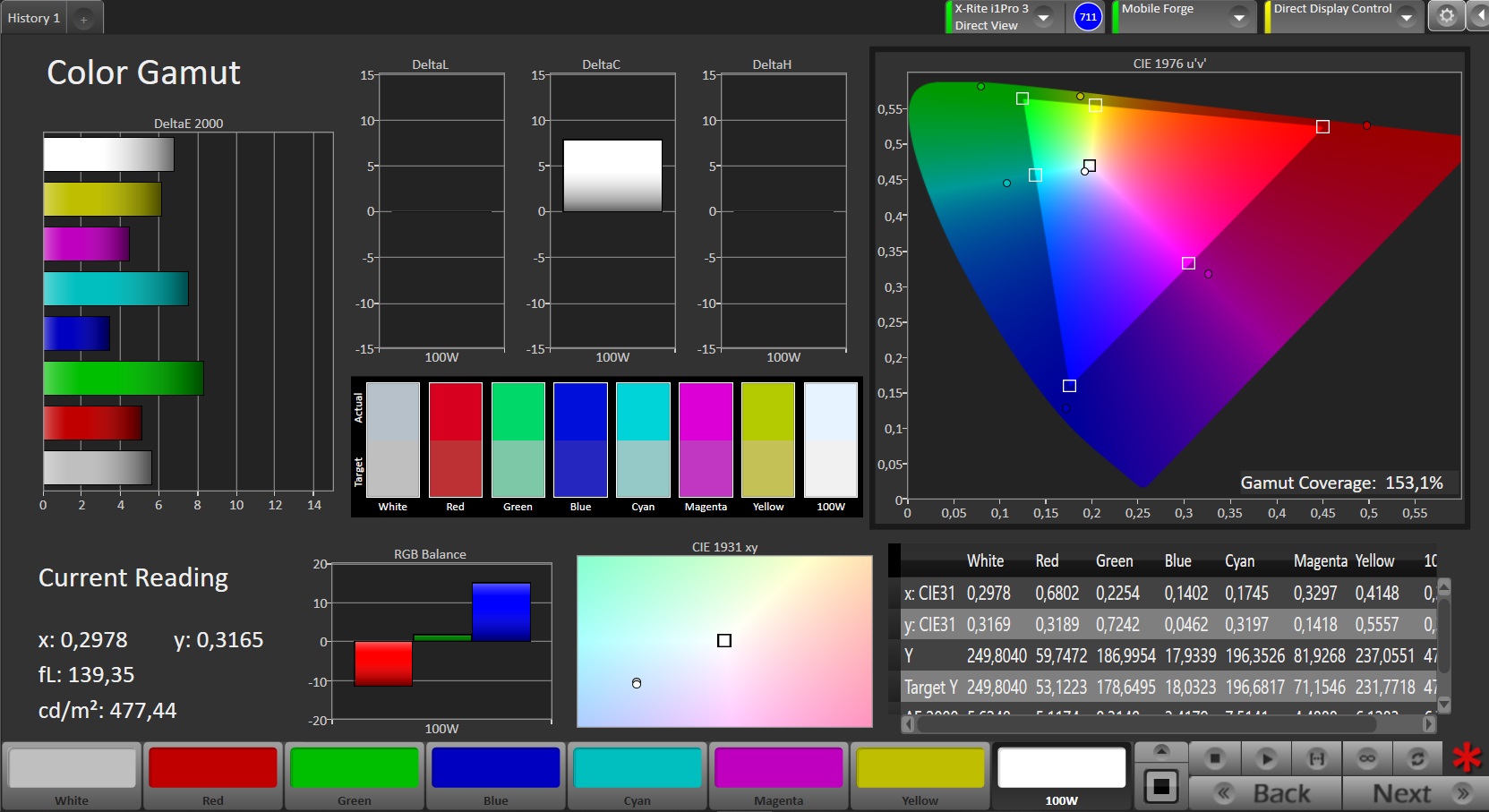 | Delta E Colorchecker * | 2.06 | 5.34 -159% | 1.4 32% | 3.2 -55% | 2.74 -33% | 3.2 -55% |