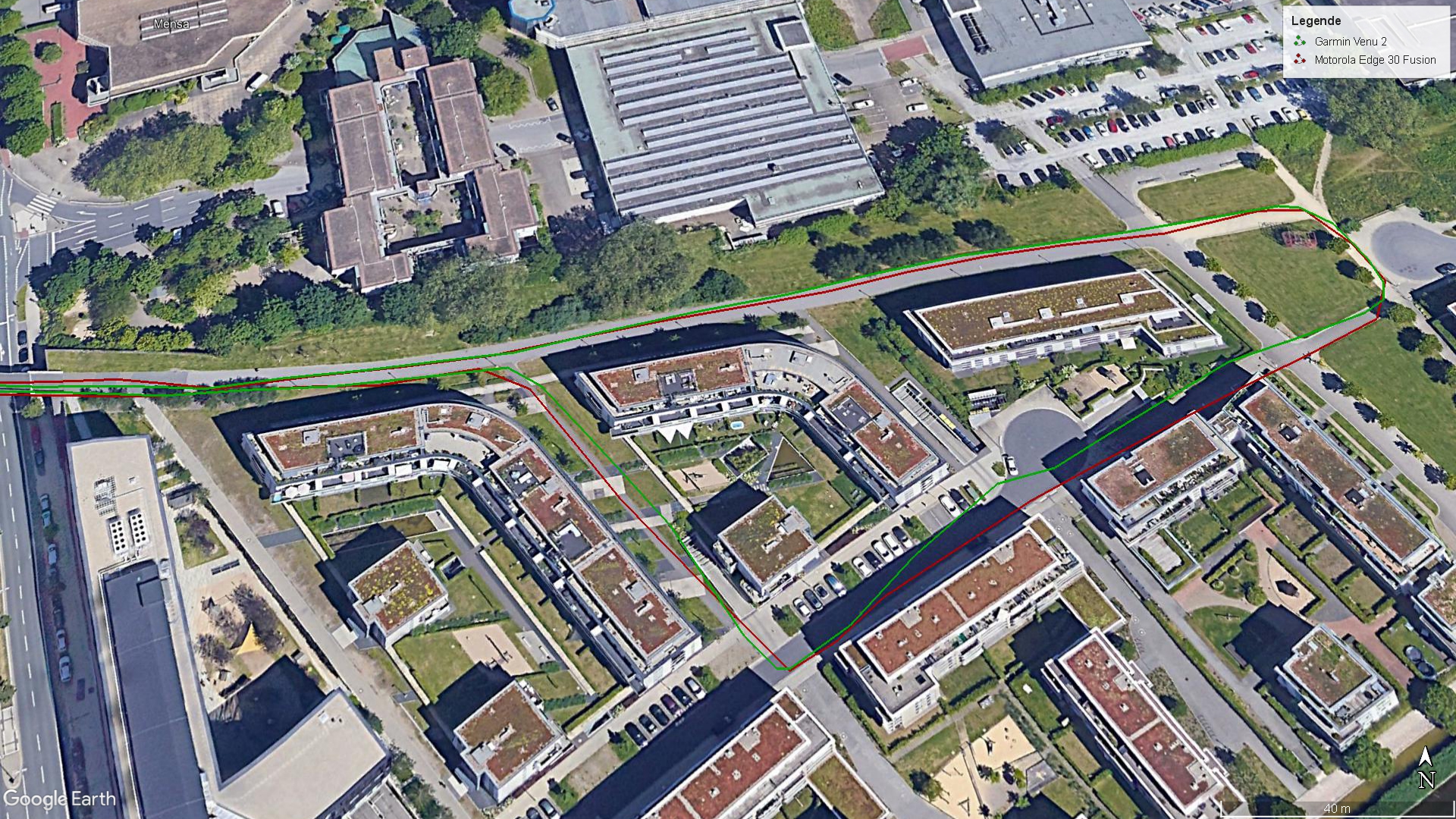 Die Vergleichsfahrt mit unserem Referenzgerät, der Garmin Venu 2, zeigt eine überzeugende Satellitenverbindung. Die Strecke wird exakt auf der Karte dargestelt, auch Kurven und Radien sind flüssig aufgezeichnet.