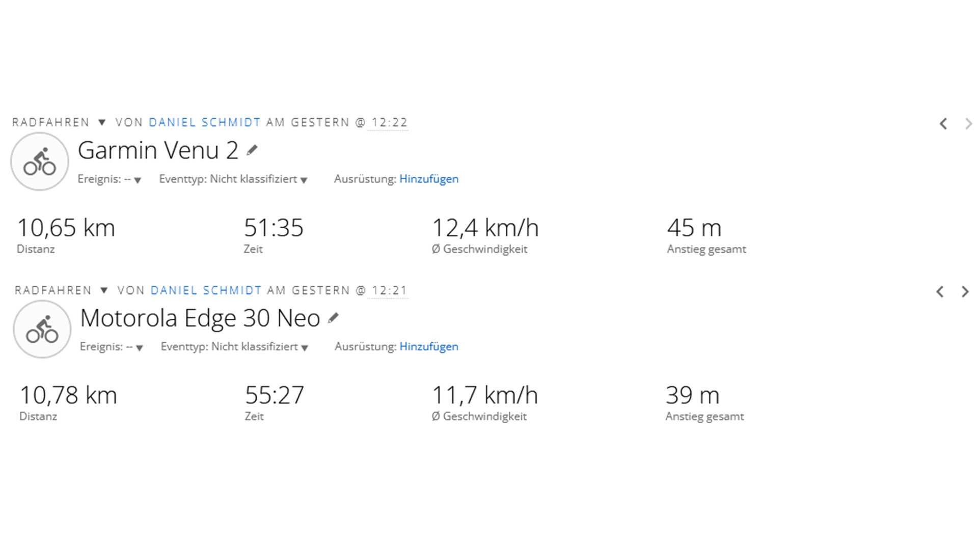 Auf einer Radfahrt mit unserem Vergleichsgerät, der Garmin Venu 2, zeigt das Edge 30 Neo Schwächen. Die aufgezeichnete Route weicht in vielen Bereichen von der Straßenführung ab. Kurven und Radien werden eckig dargestellt.