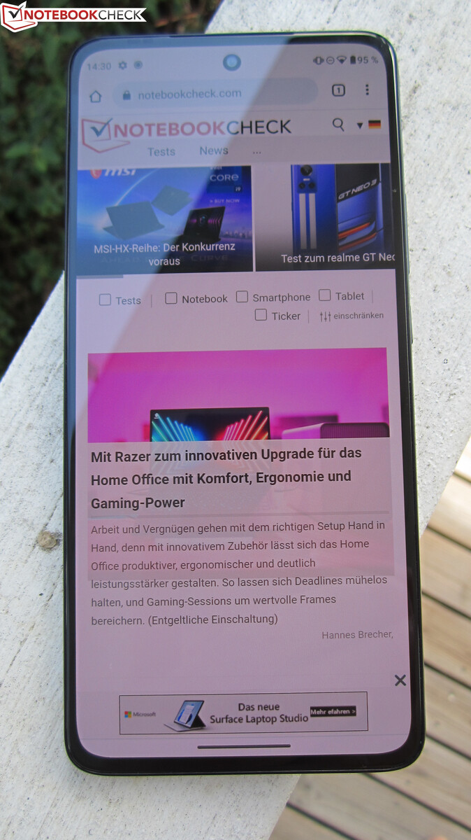 Der AMOLED-Bilderschirm des Edge 30 bringt es im Mittel auf eine Luminanz von etwa 630 cd/m², eine klare Steigerung gegenüber dem nur maximal 497 cd/m² hellen Screen des Edge 20. Trotz Unterstützung von HDR10+ bleiben aber auch beim Edge 30 HDR-Effekte überschaubar, denn mehr als 655 cd/m² schafft der Bildschirm nicht. Dass bei der Helligkeit noch mehr drin sein kann, zeigen unter den Vergleichsgeräten zum Beispiel das Samsung Galaxy A53 5G und das Xiaomi 11 Lite 5G NE.