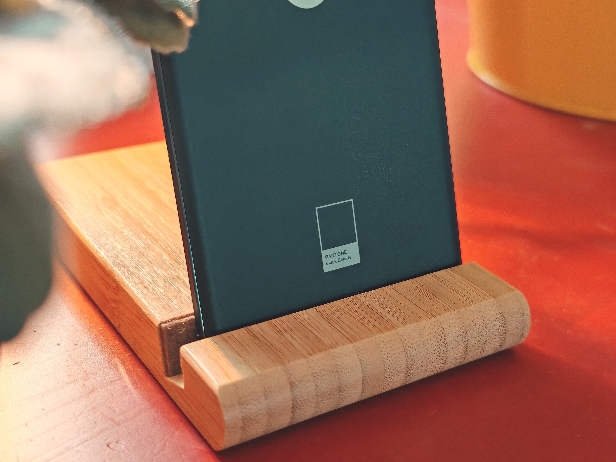 Entscheidet man sich für Blau oder Grau, so bekommt man eine Rückseite aus Kunstleder, beim schwarzen Modell gibt es eine matt-schwarze Rückseite aus Kunststoff, welche im Licht leicht schimmert. Tatsächlich ist die schwarze Variante sogar 2 Gramm leichter und 0,1 Millimeter schlanker als die Modelle mit Kunstleder-Rückseite.