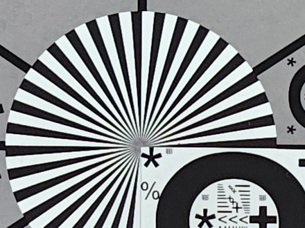 In der Mitte ist das Testchart recht scharf, zu den Rändern hin nimmt die Schärfe aber etwas ab. Text vor rotem Hintergrund wirkt leicht unscharf, insgesamt ist die Darstellung aber auf hohem Niveau. Bei 1 Lux nimmt die Schärfe deutlich ab, Details sind kaum mehr zu erkennen, das Bild wird nur mittelmäßig aufgehellt.