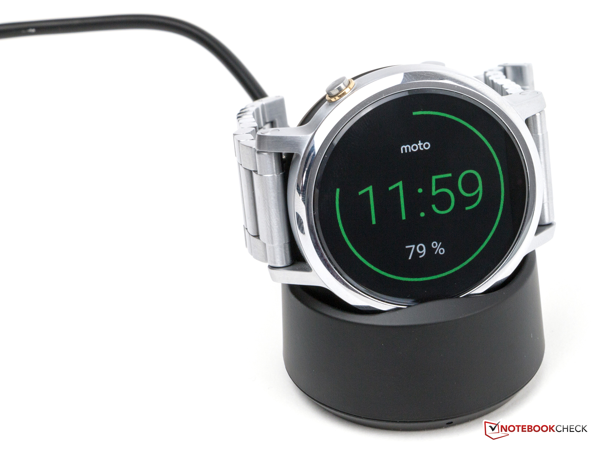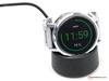 Die Moto 360 wird mit einem Netzteil, welches ein festverbautes Ladekabel besitzt, und einer Ladestation geliefert. Letztere ist kabellos, weshalb die Smartwatch auch ohne Ladekontakte auf der Unterseite auskommt. Dies funktioniert in der Praxis tadellos. Ein schöner Nebeneffekt ist, dass sich die ladende Uhr in eine Art kleine Nachtischuhr verwandelt, deren Anzeige sich farblich mit einer einfachen Wischgeste anpassen lässt. Die Ladestation ist überraschend schwer, bietet aber, auch aufgrund ihrer Gummierung auf der Unterseite, auf glatten Oberflächen einen guten Halt.