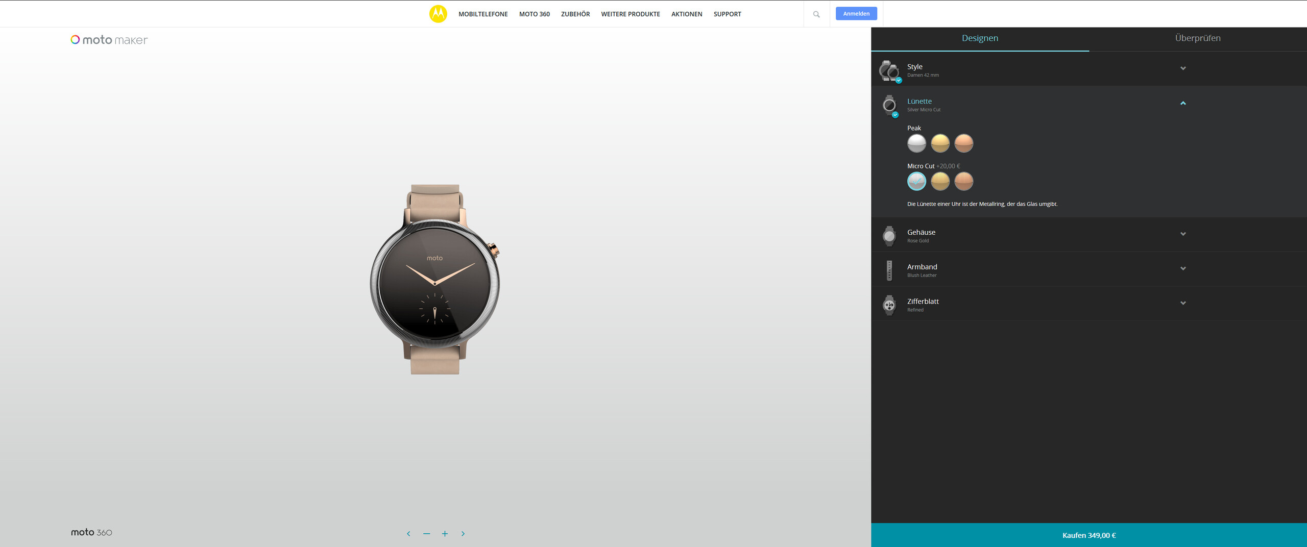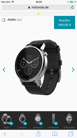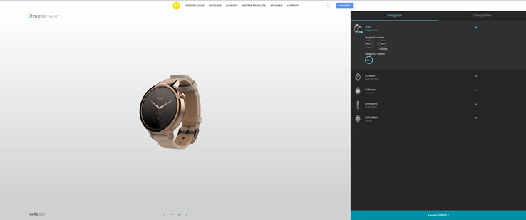 Zuerst muss die passende Variante gewählt werden. Dafür stehen die genannten beiden Herren- und Damenmodelle zur Wahl. Als einziger Hersteller überhaupt offeriert Motorola momentan ein entsprechendes Modell speziell für das weibliche Geschlecht. Es unterscheidet sich sowohl in der Armbandbreite als auch der –länge. Anschließend wird die sogenannte Lünette, der Kranz um das Zifferndisplay, ausgewählt. Dabei kann zwischen drei verschiedenen Farben und einem optionalen Muster gewählt werden.