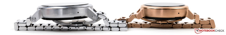 Die Damen- und Herrenmodelle unterscheiden sich nicht nur in der Breite der Armbänder, sondern auch bei der Displaydiagonale. Während die Bauhöhe immer 11,4 Millimeter beträgt, gibt es einmal das kleinere Display mit 1,37 Zoll Diagonale für die 42-mm-Varianten und das Display mit 1,56 Zoll für die größere Version. Für die Damenuhren sind 16 Millimeter-Armbänder erforderlich, die Herrenmodelle können mit beliebigen 20- beziehungsweise 22-mm-Armbändern ausgestattet werden.