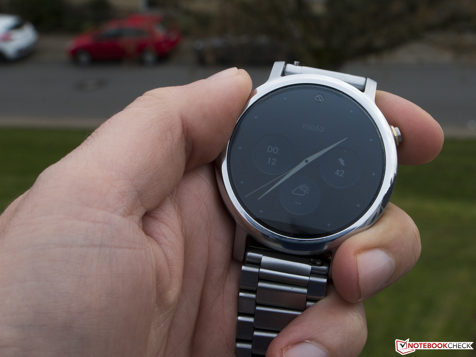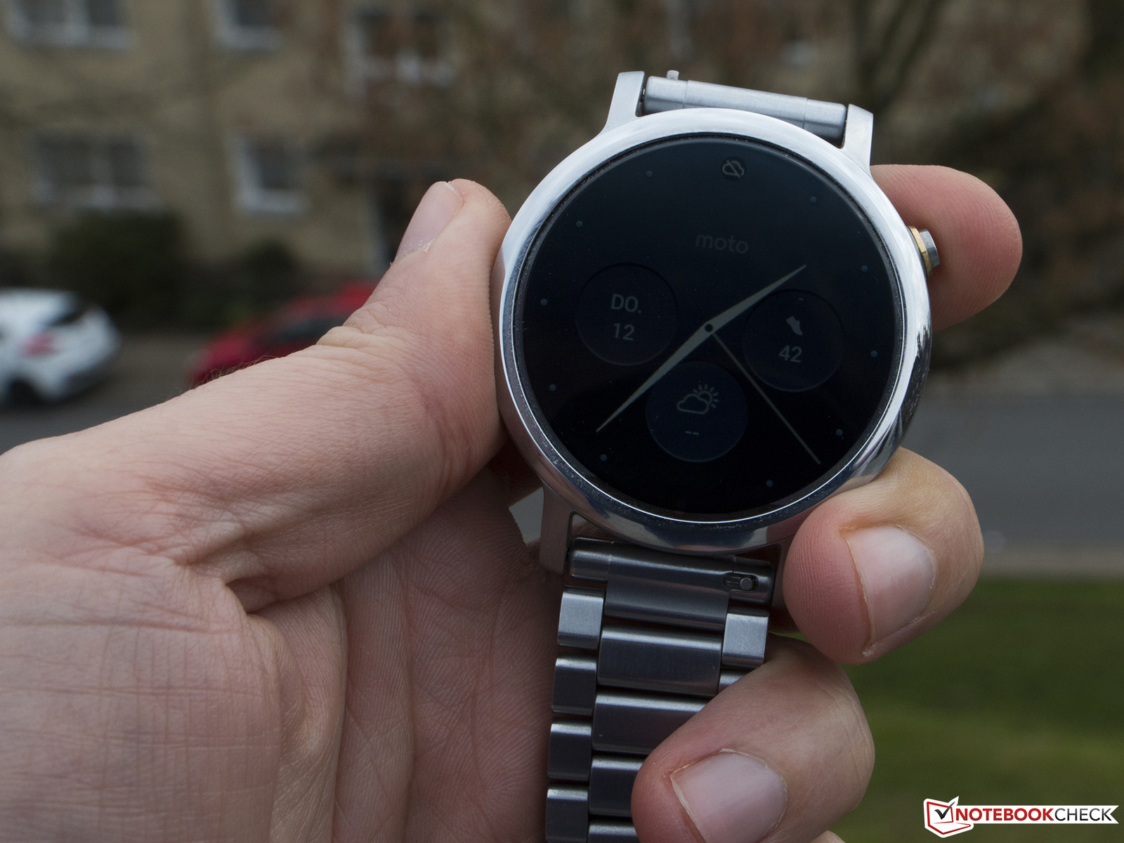 Im Außeneinsatz zeigt sich, dass reine Leuchtkraft nicht alles ist. Denn trotz der erheblich höheren Leuchtdichte zeigt die Motorola Moto 360 keine so gute Performance wie beispielsweise die Huawei Watch mit AMOLED-Display, welches von einem erheblich besseren Kontrastverhältnis profitiert.