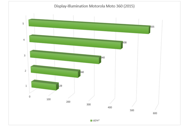 Was wir bei rein subjektiver Betrachtung des Displays jedoch schon vermutet hatten, bestätigen auch die Messungen: Der Schwarzwert ist recht hoch und erreicht bei voller Leuchtkraft 0,57 cd/m². Da hat die Moto 360 im Vergleich zu den Kontrahenten mit OLED-Panel nur ein dunkles Grau zu bieten. Das Kontrastverhältnis ist mit 974:1 dennoch gut.