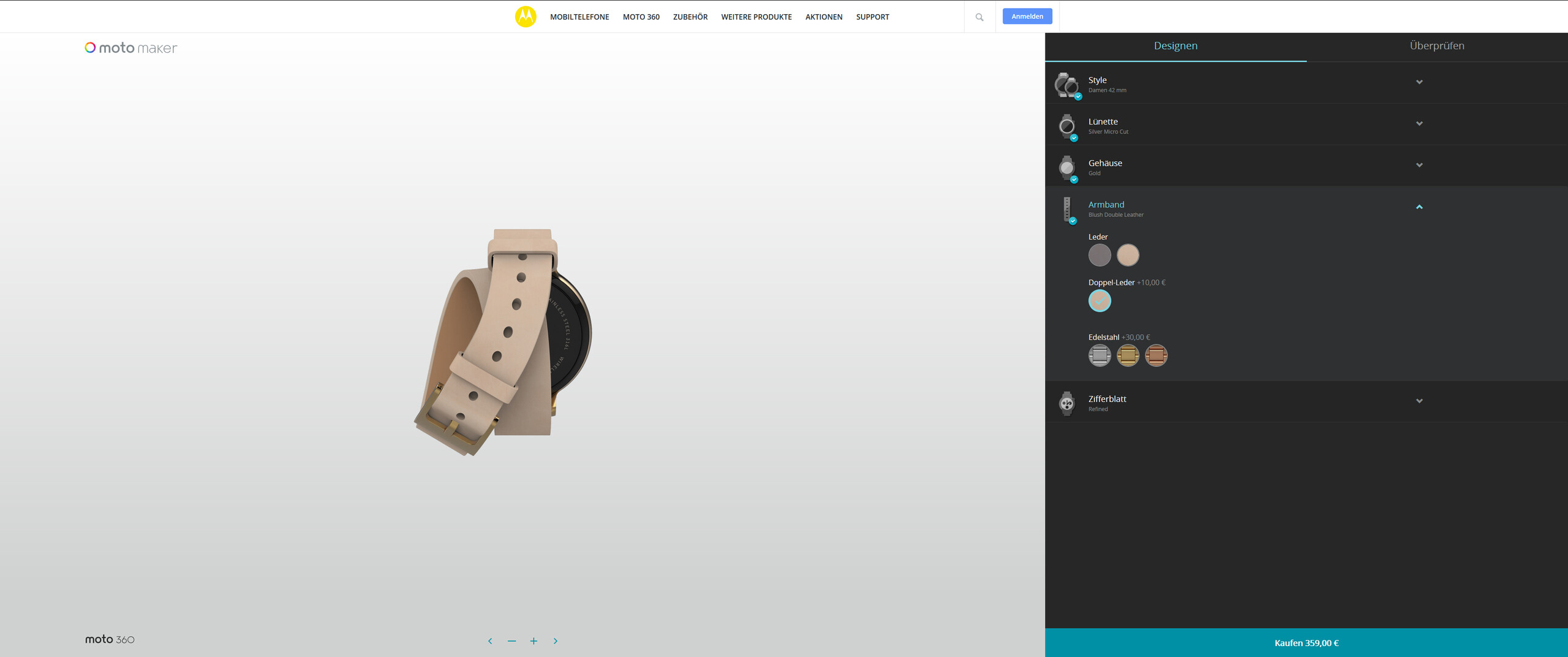 Im dritten Schritt wird die Farbe des Edelstahlgehäuses ausgewählt. Roségold und Gold sind beide aufpreispflichtig. Auch beim Armband in Schritt vier hat der Käufer die Qual der Wahl und kann zwischen Leder- oder Edelstahlarmbändern wählen. Für die Damenvariante ist zudem ein Doppel-Leder-Band verfügbar. Für die letzten beiden Möglichkeiten sind abermals Aufpreise fällig.