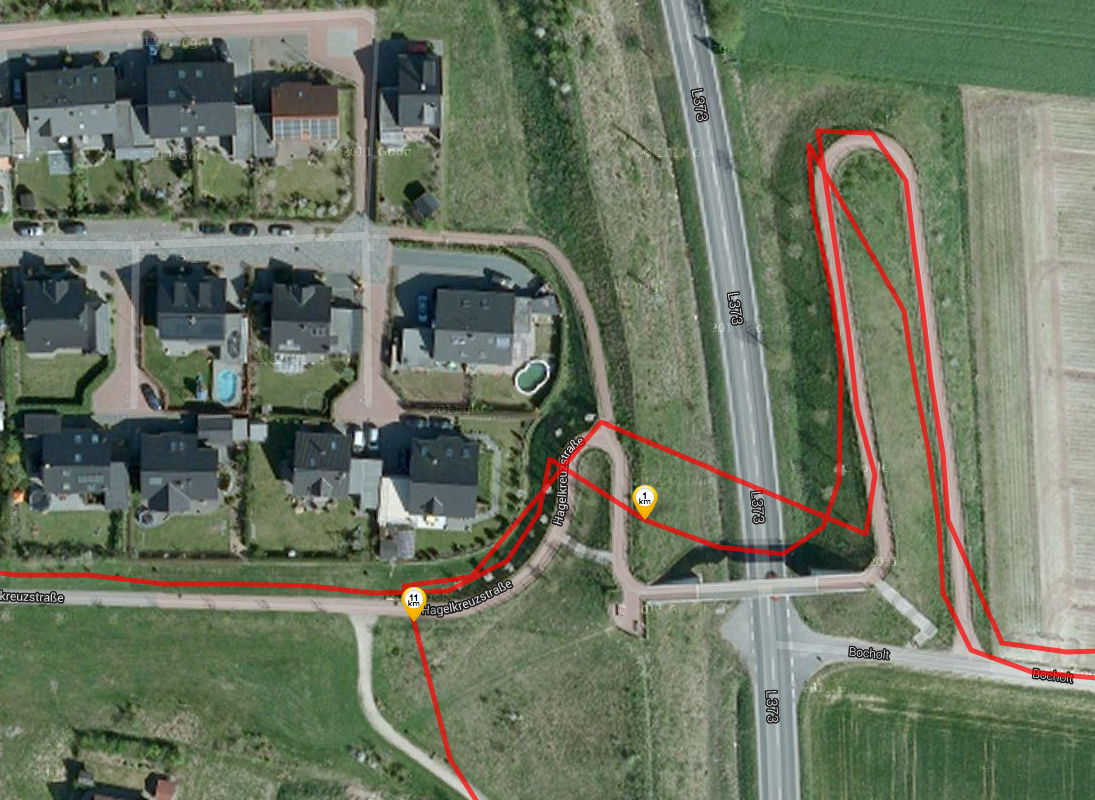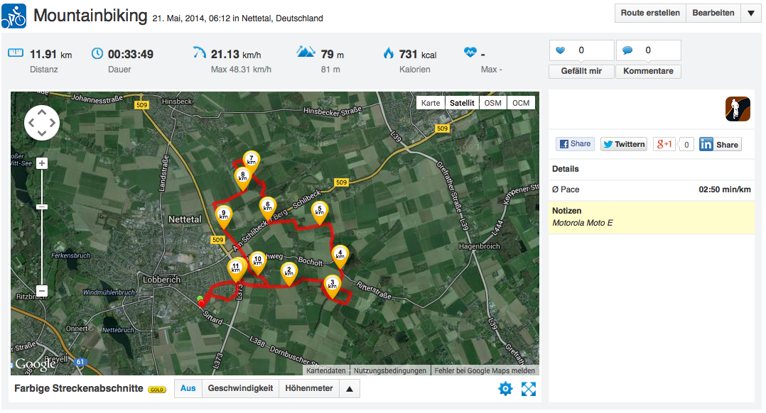 Neben dem Bluetooth-Modul in Version 4.0 LE (Low Energy) kommt ein GPS-Empfänger zum Einsatz. Dieser funkt zusätzlich nach dem russischen Standard GLONASS. Innerhalb geschlossener Räume braucht der Sat-Fix die eine oder andere Minute, unter freiem Himmel kann die Verbindung zu den Satelliten spätestens innerhalb einer Minute hergestellt werden. Im Feldtest muss sich das Moto E gegen unser Navigationsgerät von Garmin (Edge 500) beweisen. Bei der Zweckentfremdung als Outdoor-Sportutensil unterschlägt das Moto E im Gesamten eine Strecke von ca. 200 Metern (Gesamtdistanz: 12,16 km). Die wesentlichen Ungenauigkeiten treten in engen Kurven (siehe „Brücke“) oder in Gebieten auf, wo eine uneingeschränkte Sichtverbindung zu den Satelliten nicht gewährleistet ist (siehe „Wald). In Summe ist das Ergebnis dennoch respektabel, denn Smartphones aus dem Hochpreis-Segment sind in dieser Kategorie auch nicht fehlerfrei oder wesentlich besser, wie beispielsweise das Samsung Galaxy S5 oder das Sony Xperia Z2 im Test zeigen.