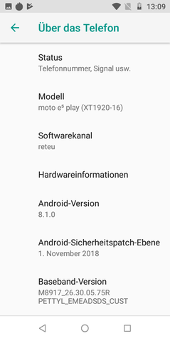 Motorola installiert auf dem Moto E5 Play ab Werk Android 8.1.0 in der Go-Edition. Die ist extra für Smartphones mit einfacher Ausstattung bei Chipsatz und Arbeitsspeicher ausgelegt, belegt weniger internen Speicher und braucht weniger Leistung als herkömmliches Android. Ein Update auf aktuelles Android 9 Pie ist wie so oft bei günstigen Smartphones eher nicht zu erwarten. Ein Fingerzeig darauf ist das zum Testzeitpunkt (Anfang Februar 2019) veraltete Sicherheits-Patch von November 2018.
