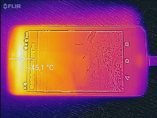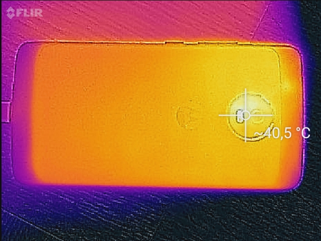 Unter maximaler Last erwärmt sich besonders der obere Bereich der Vorderseite. Das ist natürlich ungünstig, weil sich hier beim Telefonieren das Ohr befindet. Wer also zockt und währenddessen einen Anruf bekommt, bei dem kann es schonmal zu "heißen Ohren" kommen. Die maximale Erwärmung ist mit 43 Grad nicht gerade niedrig und deutlich spürbar, aber auch nicht kritisch. Nach unten hin nimmt die Erwärmung spürbar ab, an der Rückseite zeigt sich ein ähnliches Bild. Auch im Idle-Betrieb ist schon eine leichte Erwärmung im oberen Bereich der Vorderseite fühlbar, auch hier bleibt die Rückseite deutlich kühler.