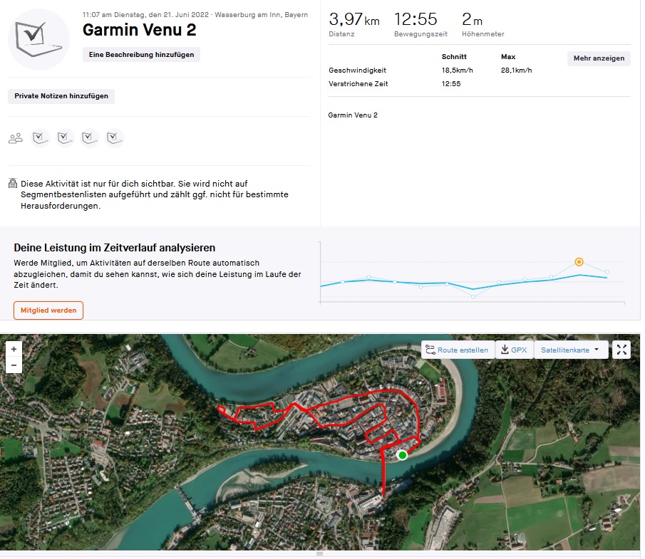 Um die Ortungsgenauigkeit unseres Testgerätes in der Praxis einschätzen zu können, zeichnen wir parallel eine Strecke zu Vergleichszwecken mit der Garmin Venu 2 auf. Die Positionsbestimmung erfolgt mittels der Satellitensysteme GPS (L1), GLONASS, BeiDou und Galileo (E1) sowie der SBAS-Unterstützung.