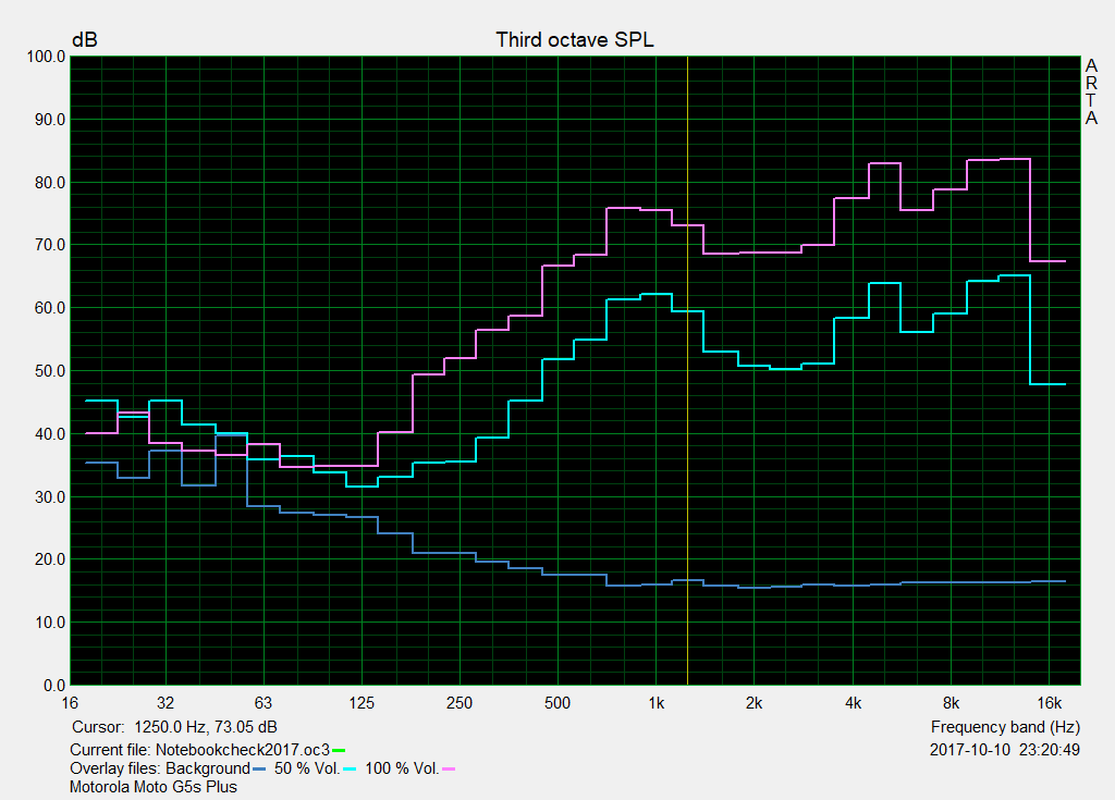 Am Smartphone ist ein Lautsprecher verbaut, der ziemlich stark aufdrehen kann und problemlos kleinere Räume beschallt. Während der Bass wie gewohnt kaum zu hören ist, liefert die Soundausgabe einen erstaunlich guten Klang. Sowohl die Vergleichsgeräte als auch die meisten anderen bei uns getesteten Geräte liefern hier zum Teil deutlich schlechtere Werte. Das Moto G5s Plus verpasst hier nur knapp die 10%-Hürde der besten Geräte in der Soundwiedergabe.