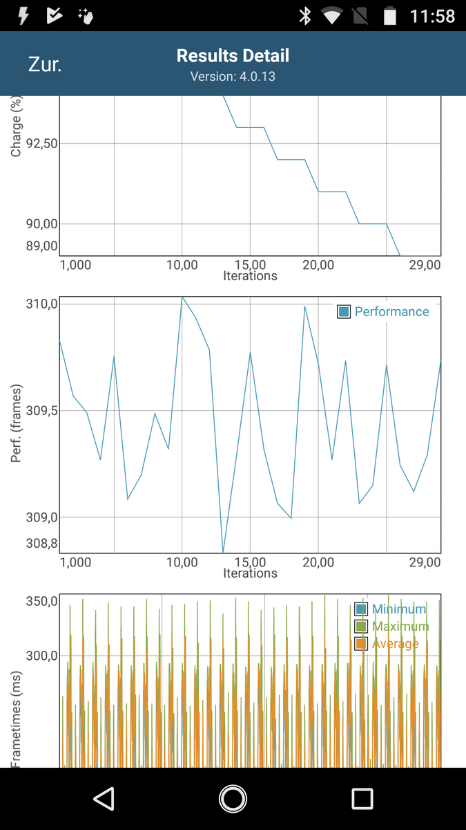 Mit dem Benchmark GFXBench und dem eingebauten Akku-Test können wir feststellen, dass auch nach 30 Benchmark-Zyklen die Frameraten gleich bleiben. Ein Drosseln der Leistungskomponenten unter längerer Last ist also nicht zu erwarten.