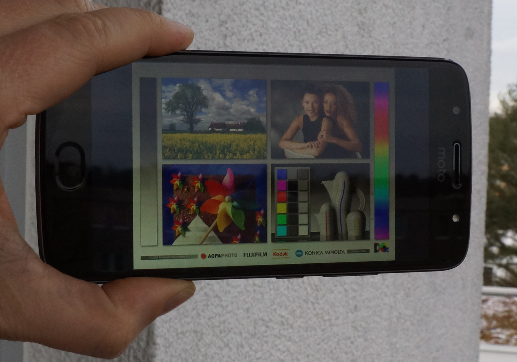 Szene 1Szene 2Szene 3Auch unter festgelegten Lichtbedingungen in unserem Labor muss sich das Moto G5s beweisen. Das fotografierte Testbild wirkt dabei recht scharf und auch Farbübergänge oder Schrift vor farbigem Hintergrund werden gut dargestellt. An Rändern zeigen sich allerdings in der Vergrößerung leichte Artefakte. Manche Farbflächen weisen in der Reproduktion Unsauberkeiten auf, die Farbdarstellung ist im Vergleich zum Referenzfarbraum recht farbtreu.