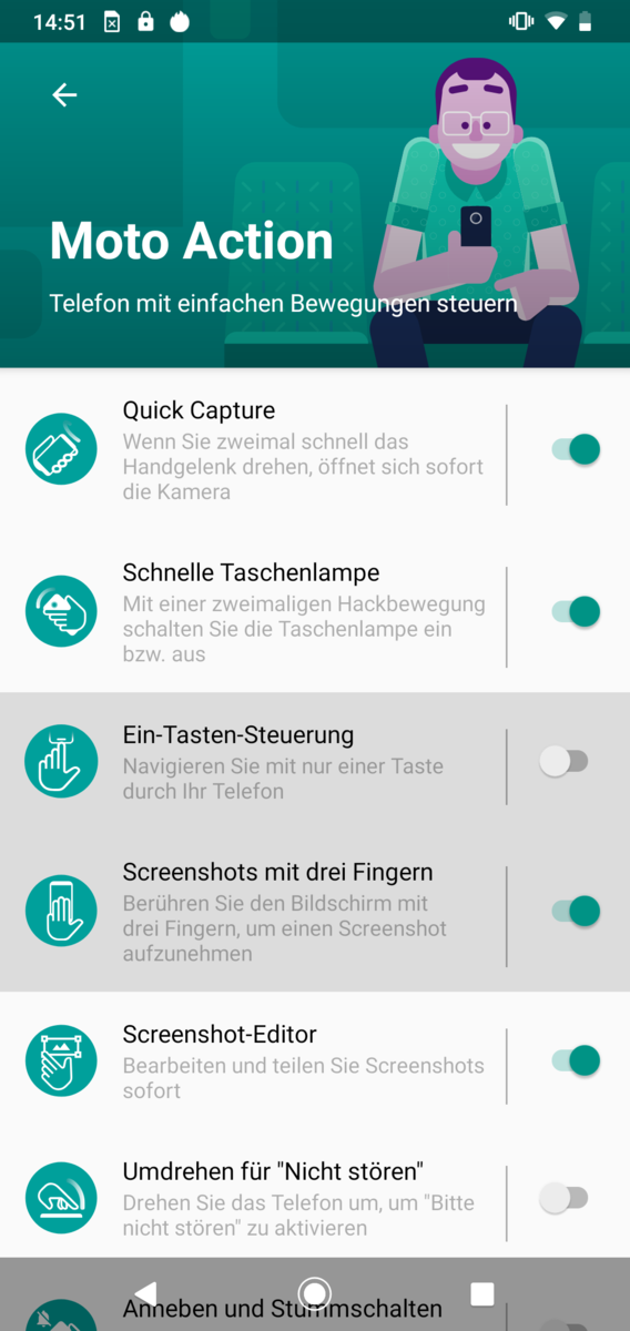 Über den Touchscreen lässt sich das Smartphone problemlos, zuverlässig und zügig bedienen, egal an welcher Stelle man den Bildschirm berührt. Über die Moto-App lassen sich diverse Bediengesten als Abkürzung festlegen, so kann man beispielsweise mit dem Smartphone in der Hand das Handgelenk drehen, um die Kamera zu starten oder mit drei Fingern auf den Bildschirm tippen, um einen Screenshot aufzunehmen. Das funktioniert tatsächlich, löst aber oft ungewollt auch andere Funktionen aus.