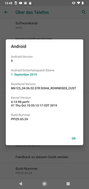 Das recht pure Android ist noch nicht auf die Version 10 gepatcht, die Sicherheitspatches sind vom 1.9.2019 und damit zum Testzeitpunkt noch einigermaßen aktuell. Ein Update auf Android 10 ist wahrscheinlich, aber noch nicht offiziell angekündigt.