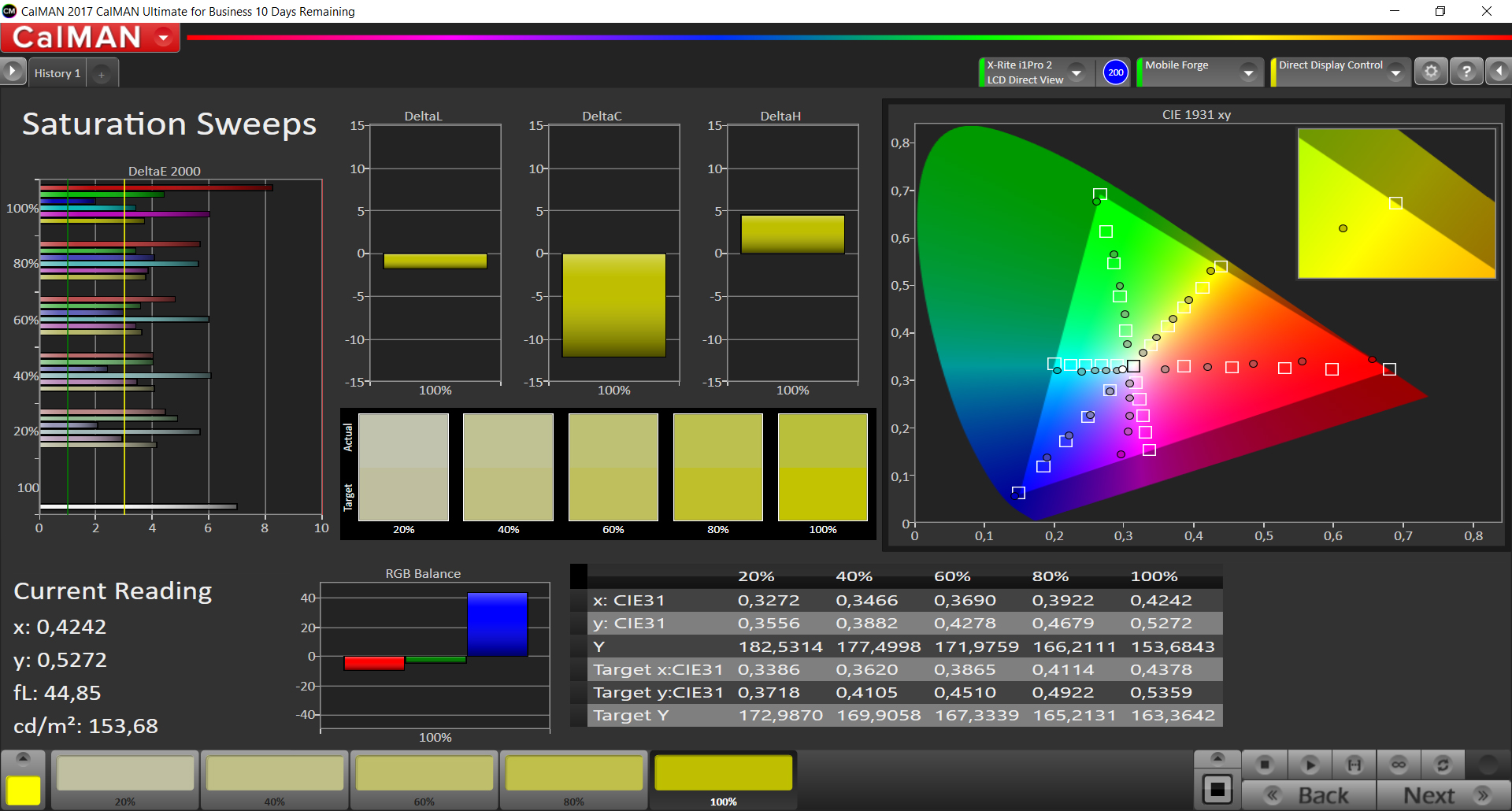 | Delta E Colorchecker * | 4.3 | 1.7 60% | 2.6 40% | 3.2 26% | 4.18 3% | 1.3 70% |