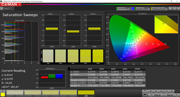 Bei der Farbdarstellung können Anwender zwischen den Displayeinstellungen „Standard“ und „Intensiv“ wählen. Beide Modi überprüfen wir mit dem Spektralfotometer und der CalMAN-Software und finden jeweils einen leichten Blaustich. Mit einer maximalen Farbtemperatur von 7.340 K (ideal wären 6.500 K) fällt er jedoch nicht allzu hoch aus und ist im Standardmodus mit 7.075 K fast schon vernachlässigbar gering. Gleiches gilt auch für die Abweichungen bei der Farbdarstellung, die in beiden Bildmodi nur geringfügig über dem Optimum (Delta-E < 3) liegen. Insgesamt bekommt man die akkuratere Farbdarstellung, wenn man den Standardmodus auswählt, aber eine höhere Farbraumabdeckung, wenn man zum Intensiv-Modus wechselt.