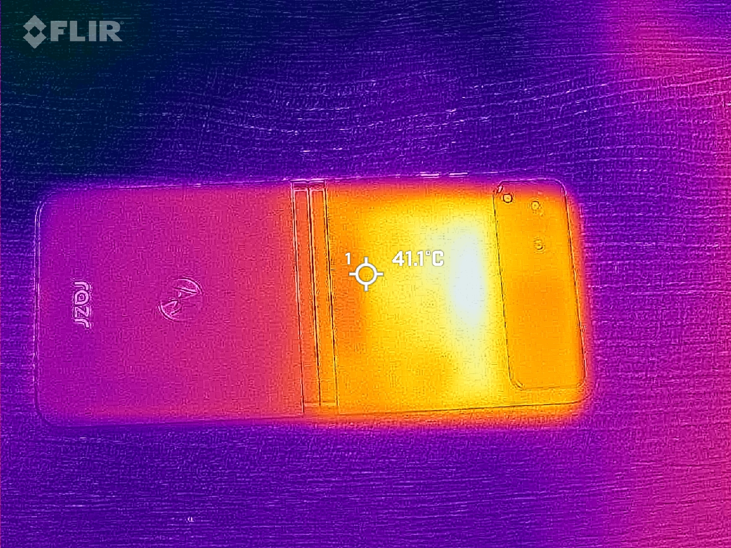 Unter langer, hoher Last können die Temperaturen am Gehäuse des Razr 40 auf bis zu 51,2 °C steigen. Diese Erwärmung ist lokal stark begrenzt und im Alltag wohl nur selten zu erreichen, aber bei hohen Umgebungstemperaturen kann das Phone beim Zocken durchaus warm werden.