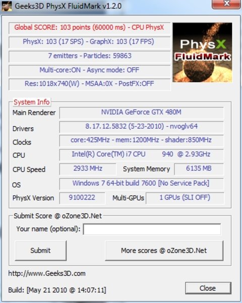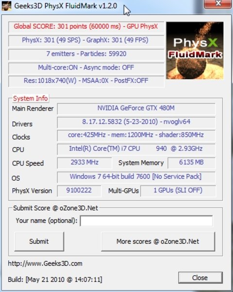 Ein Alleinstellungsmerkmal von NVidia ist die Berechnung von PhysX Effekten auf der Grafikkarte. Dies ist natürlich auch mit dem neuen Fermi Flaggschiff möglich und verhilft bei Batman: Arkham Asylum, Mirrors Edge oder dem kommenden Mafia 2 zu schöneren Effekten (ohne GPU Unterstützung meist nicht flüssig spielbar). Im Test erreichte der FluidMark das fast 3-fache Ergebnis wenn PhysX auf der GTX 480M ausgeführt wurde (17 versus 49 fps). Zum Vergleich, eine GeForce GTX 280M erreichte laut Onlineeintrag auf ozone3d.net 31 fps und damit 184 Punkte (27% weniger).