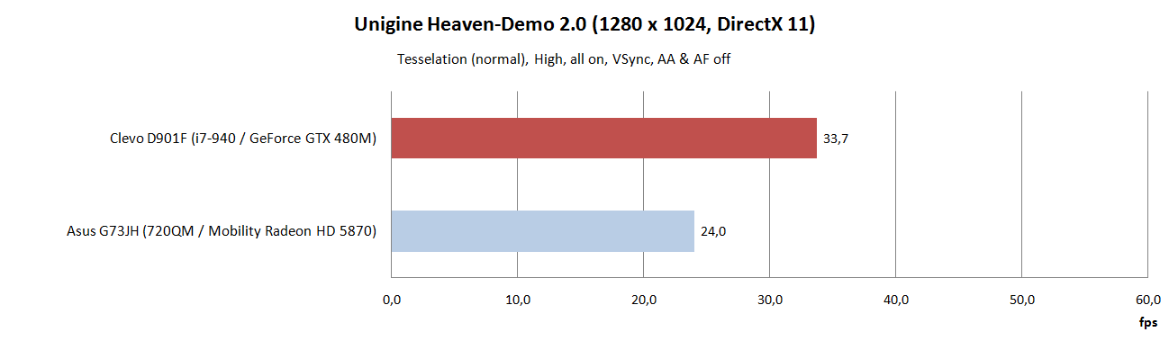 Das Ergebnis fällt eindeutig aus. Bei den gewählten Einstellungen (Tessellation (normal) | High | all on | VSync, AA und AF jeweils off) zeigten sich zwar beide Grafikchips an Rande ihrer Leistungsfähigkeit hinsichtlich flüssiger Darstellung, dennoch konnte die GTX 480M von Nvidia die HD 5870 im Asus GX73JH mit einem Vorsprung von rund 30% deutlich hinter sich lassen.