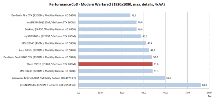 Dies dürfte mitunter auch eine Erklärung für das Abschneiden der GTX 480M sein, die in diesem Test die Performance verschiedener Notebooks mit ATI Mobility Radeon HD 5870 nicht wirklich überbieten kann. Unsere Testkonfiguration erreicht mit 51 fps bei höchsten Grafikdetails ein praktisch idente Performance wie die HD 5870 im MSI GT740. Das Spiel war damit problemlos flüssig spielbar.