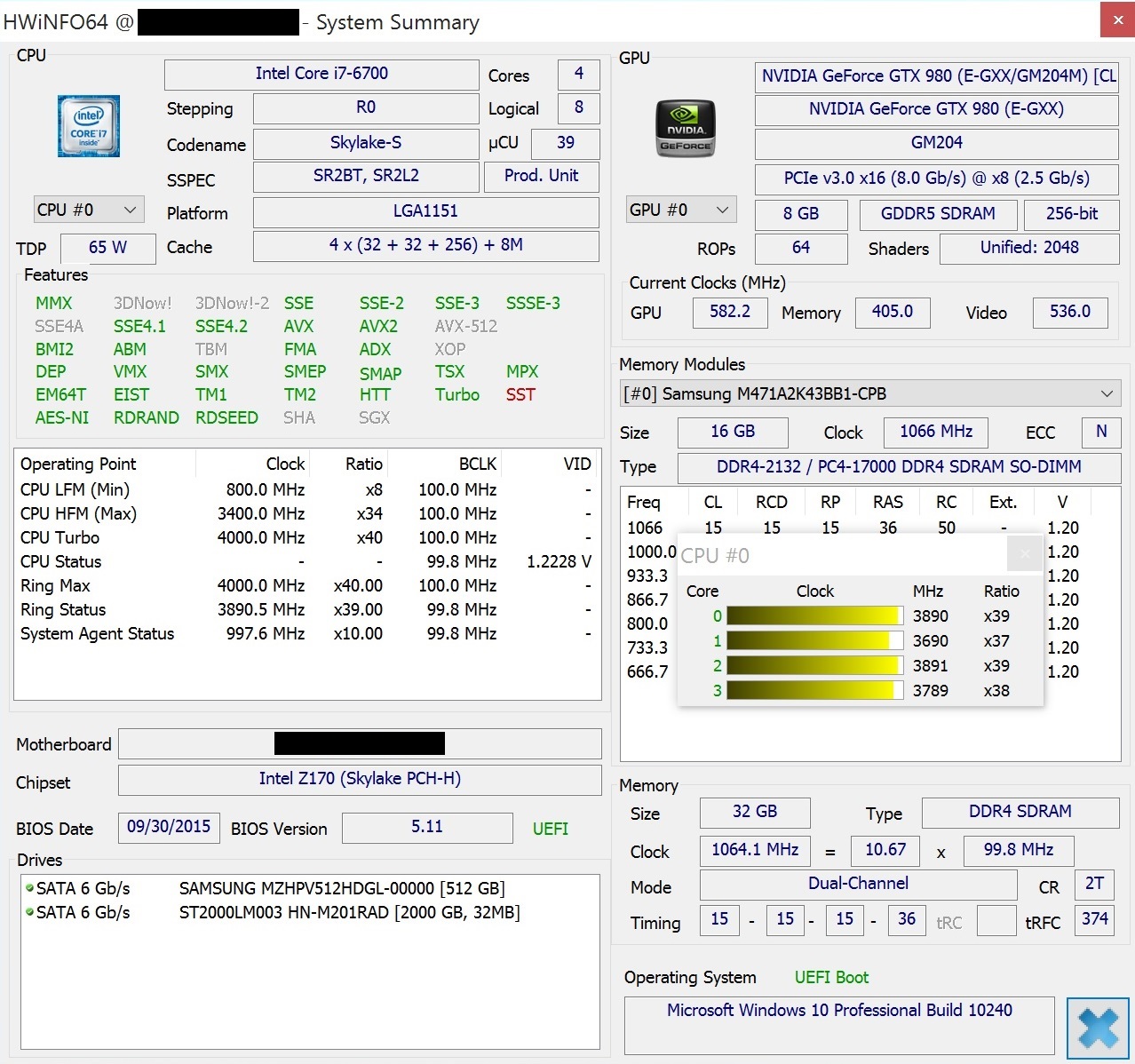 Um die Abwärme der GeForce GTX 980 ordentlich bewältigen zu können, setzt der 17-Zoll-Koloss auf drei Gehäuselüfter, wobei einer für die Desktop-CPU reserviert ist. In unserem Fall war das 3,4-4,0 GHz flotte Skylake-Modell Core i7-6700 verbaut, das acht MByte L3-Cache enthält und per Hyper-Threading bis zu acht Threads parallel bearbeiten kann (14 nm, 65 Watt TDP). Dank der mächtigen Kühlung ist der Turbo Boost – wie die unteren Screenshots zeigen – voll aktiv.