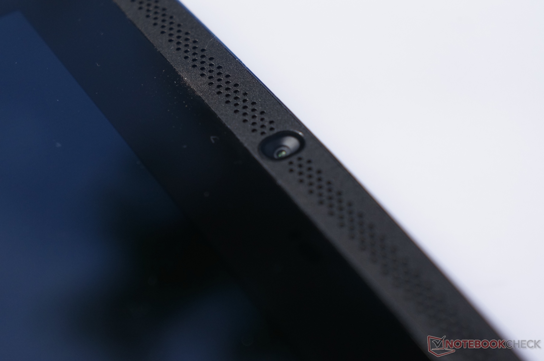 Die verbauten Stereolautsprecher befinden sich neben dem Display und strahlen direkt zum Nutzer. Zusätzlich gibt es auf den Seiten noch "Bass Ports" für tiefere Frequenzen. Im Test zeigt sich, dass die Lautsprecher zwar unter 300 Hz stark abfallen, darüber aber ein relativ gutes Bild abgeben. Die Ausgabe ist etwas höhenlastig, jedoch deutlich linearer als z. B. beim Acer Aspire E5-571G, einem ausgewachsenen 15-Zoll-Notebook.