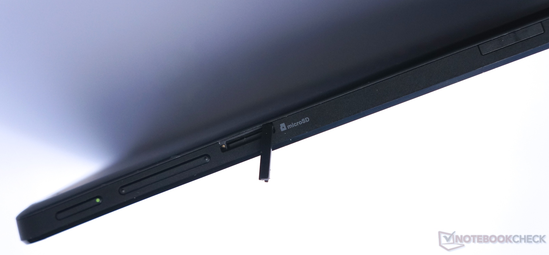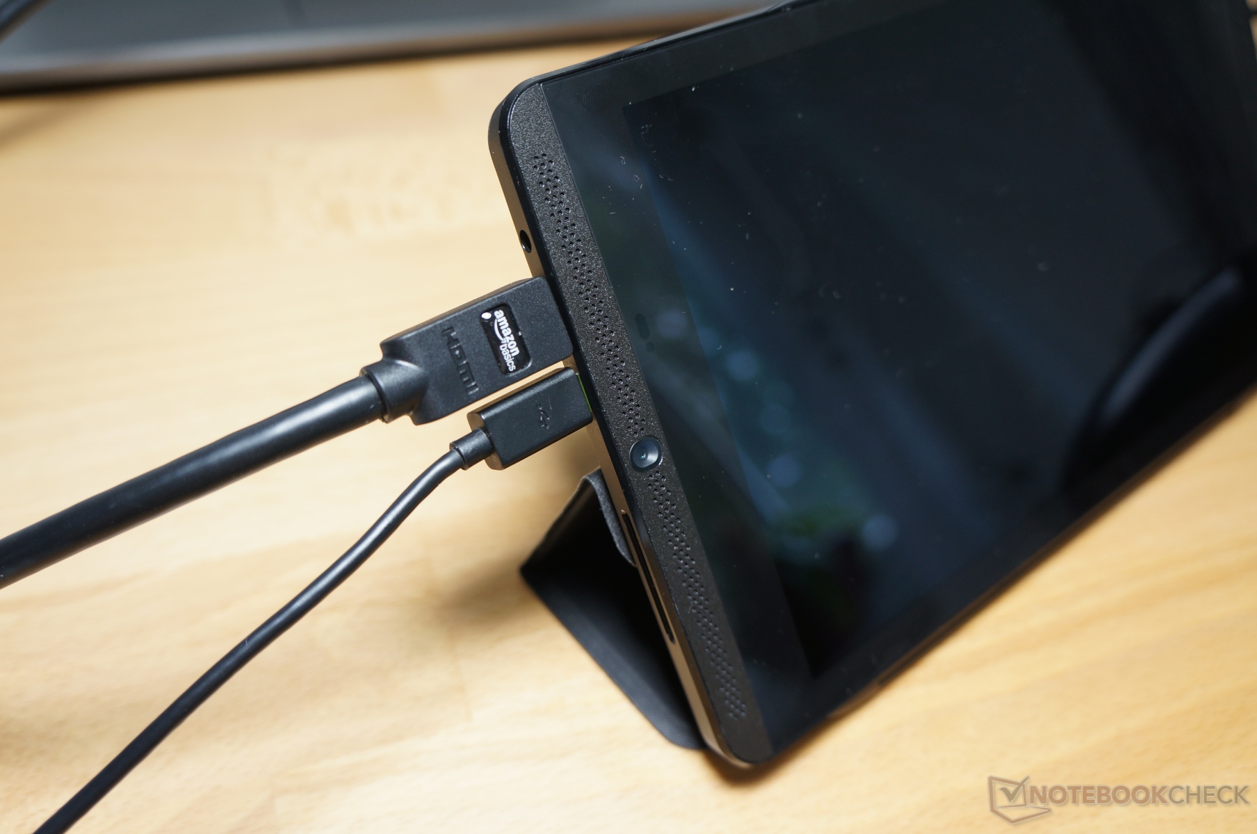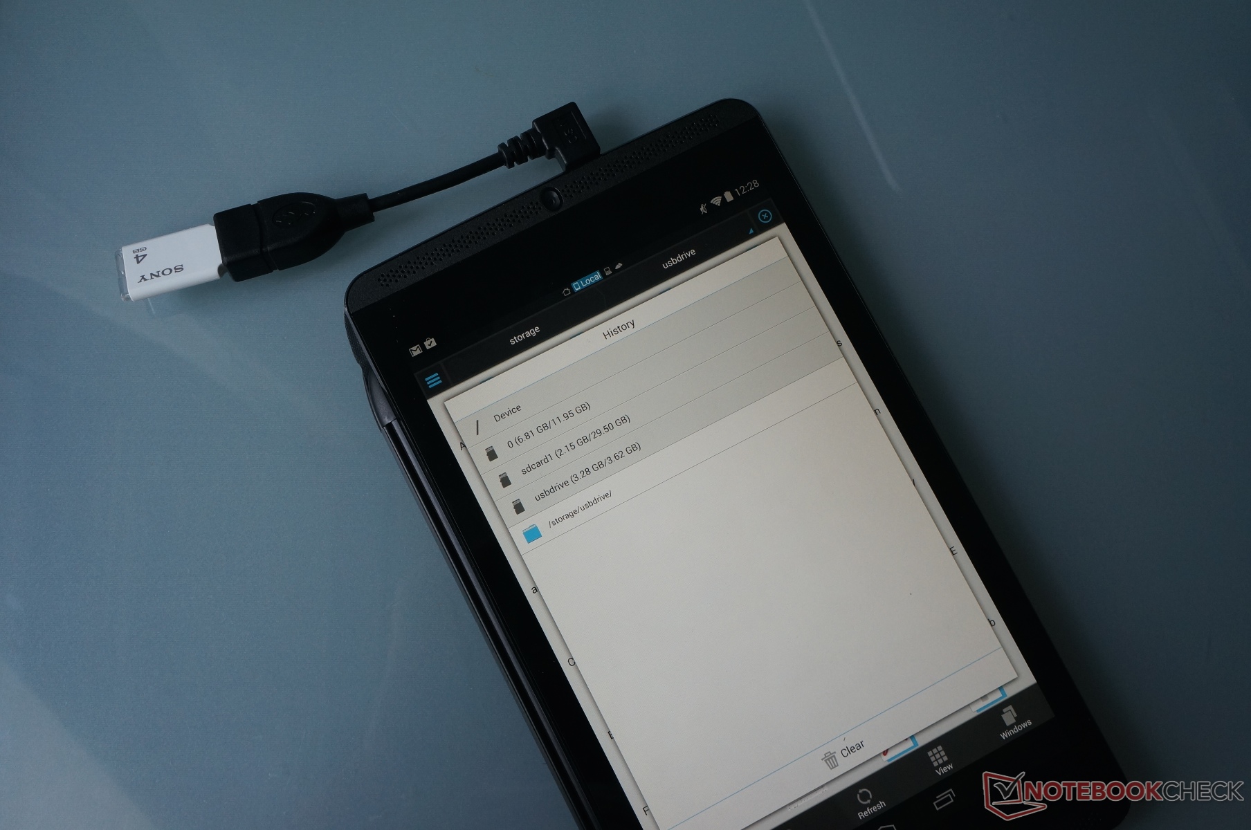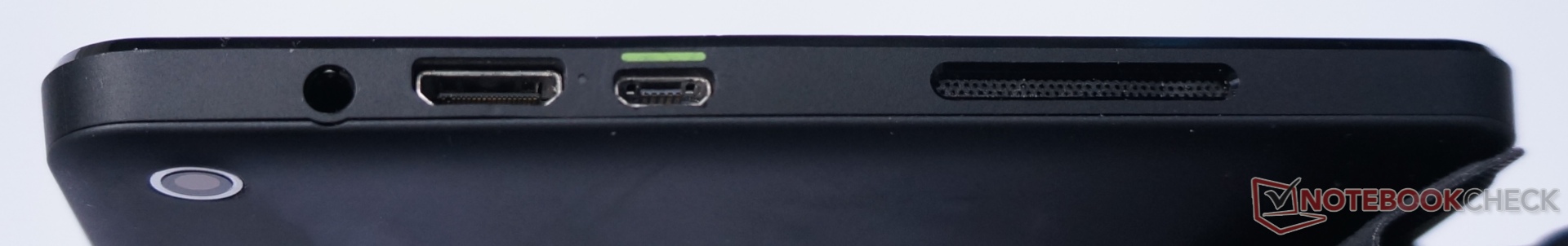 Die gebotenen Anschlüsse beschränken sich auf das Klassenübliche. Micro-USB-2.0, Mini-HDMI und Headset Port befinden sich alle auf der Oberseite des Tablets. Auf der rechten Seite neben der Lautstärkewippe ist der Schacht für die Micro-SD-Karte. Dieser ist leider sehr tief verbaut uns lässt sich nur mit einem Hilfmittel einlegen bzw. herausnehmen. Der Micro-USB-Port unterstützt auch USB OTG zum Anschluss von USB-Sticks und Peripherie. Im Test funktionierte ein USB-Stick ohne Probleme, die Adata SE720 USB 3.0 SSD wurde jedoch nicht erkannt. Kabelgebundene Maus und Tastatur wurden per USB Hub ebenfalls problemlos erkannt, und in Verbindung mit dem HDMI-Ausgang ließ sich ein kleiner Desktop einrichten.