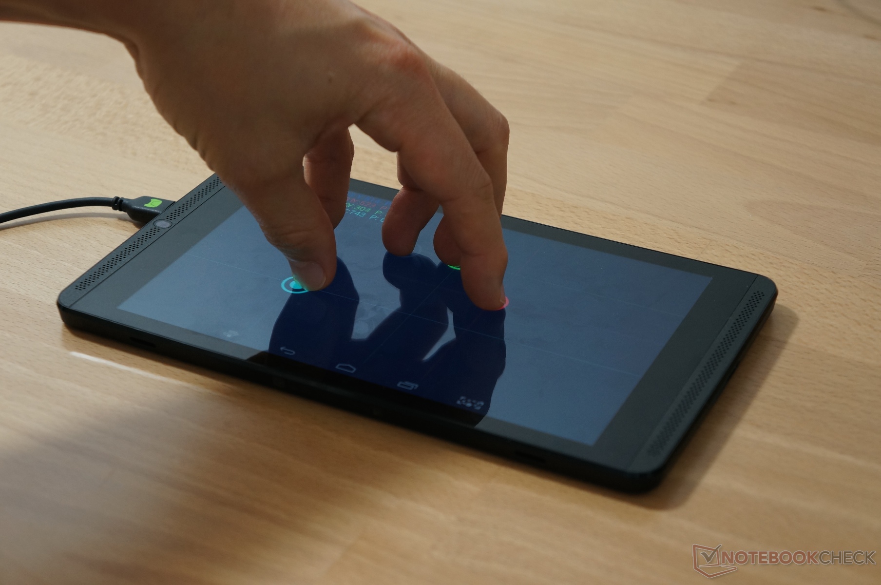 Der Multi-Touchscreen erkennt bei uns im Test alle 10 Finger und gefällt durch die präzise und flüssige Bedienung, welche er ermöglicht. Im Vergleich zur Shield Konsole sind auch keine störenden Strukturen am Bildschirm sichtbar.