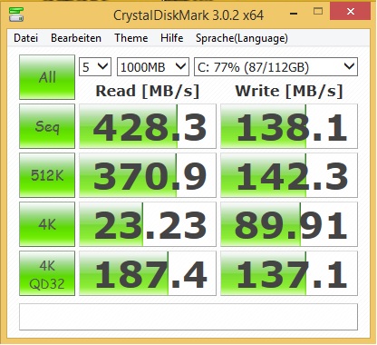 Die Datenspeicherung übernimmt in unserer Test-Konfiguration ein Verbund aus einer herkömmlichen HDD sowie einem SSD Laufwerk. Die Festplatte von HGST operiert mit 7200 U/Min und verfügt über 500 GB Speicherkapazität für Bilder, Videos oder Spiele. Die 120 GB fassende Mushkin Atlas SSD ist über den mSATA-Slot angeschlossen und bietet neben dem Windows 8 64 Bit Betriebssystem noch Platz für einige weitere Programme.