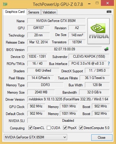 | GeForce GTX 850M DDR3 | Dual-Core (332.35) | |