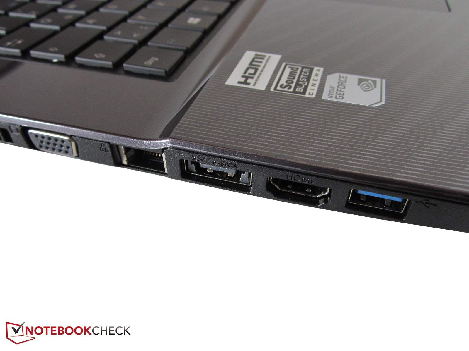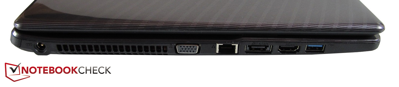 Die Anschlussausstattung entpuppt sich als reichlich unspektakulär. Ein analoger und ein digitaler Bildausgang (VGA + HDMI) sind im Multimedia-Segment ebenso Pflicht wie zwei Audio-Buchsen, ein RJ45-Gigabit-Lan-Port und eine Öffnung für Kensington Locks. Dazu gesellen sich ein Kartenleser, zwei USB-3.0-Ports, ein USB-2.0-Port und eine eSATA-/USB-3.0-Combo.