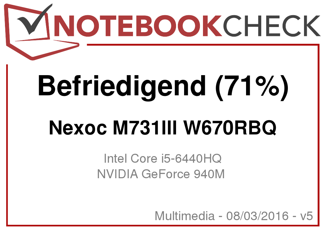 Daneben ist das M731III (W670RBQ) nach wie vor ein altbackenes Chassis mit Schwächen bei der Geräuschentwicklung unter Last, einem empfindlichen Hochglanz-Finish und schlechten Lautsprechern. Dennoch kann die Konfiguration ihre Fans finden, denn die Hardware mit i5, 250-GB-SSD, 1-TB-HDD, 940M nebst sehr guten Wartungsoptionen wird von Nexoc günstiger angeboten als beim Massenhersteller.