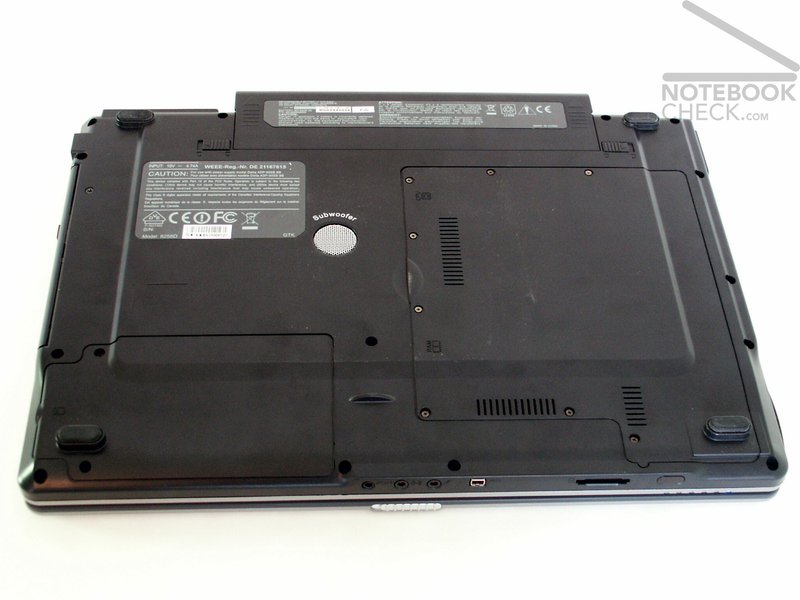 Obwohl der Großteil der Rückseite durch den etwa zwei Zentimeter hervorragenden Akku eingenommen wird, befinden sich hier noch ein Kensington Lock, 2 USB Ports, S-Video Port, der Stromanschluss und eine Buchse für den Anschluss eines Antennenkabels (für die mit TV-Tuner ausgestattete Variante).
