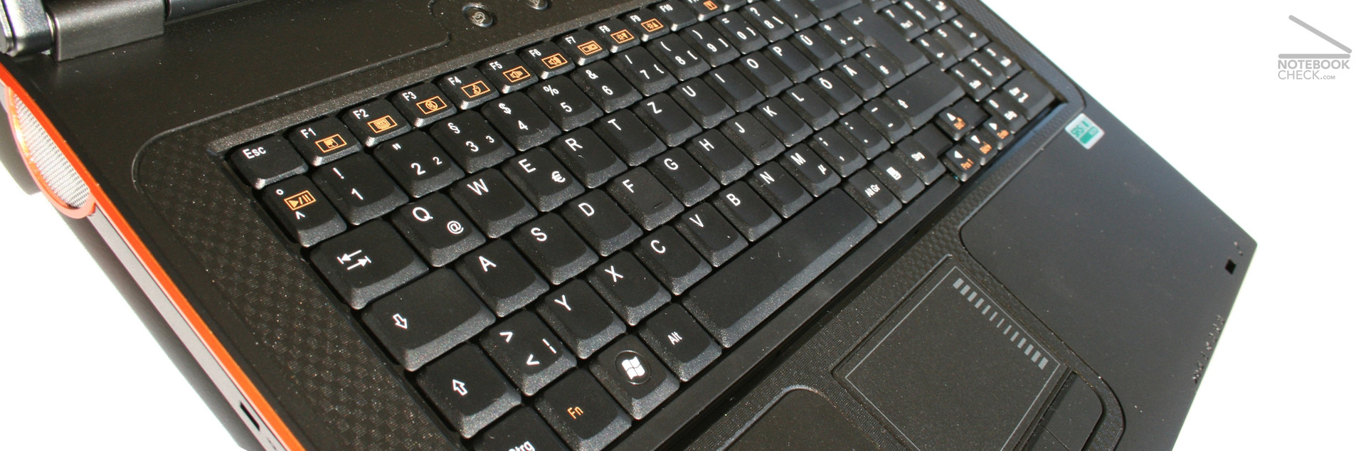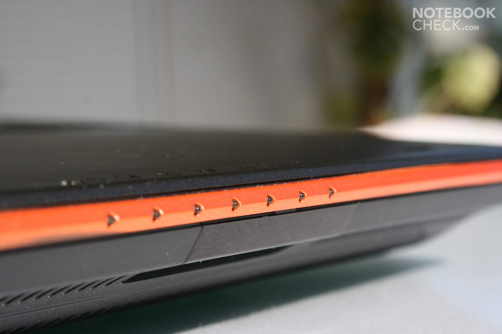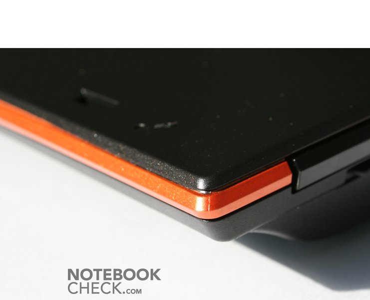 Die Verarbeitung kann nur als ausreichend klassifiziert werden. Im Mittelteil klappert die Tastatur, der orange Streifen der das Gehäuse umrandet ist nur mäßig genau lackiert, außerdem weist das Plastik im "Carbon-look" einen Verarbeitungsfehler auf. Auf Druck reagiert das Notebook mit Knarzen und Knacken. Die Schaniere des Displays hingegen sind gut verarbeitet und das Display braucht viel Kraft um bewegt zu werden und ist so immer stabil fixiert. Aus unerfindlichen Gründen kann das Display nicht um 180 Grad nach hinten geneigt werden.