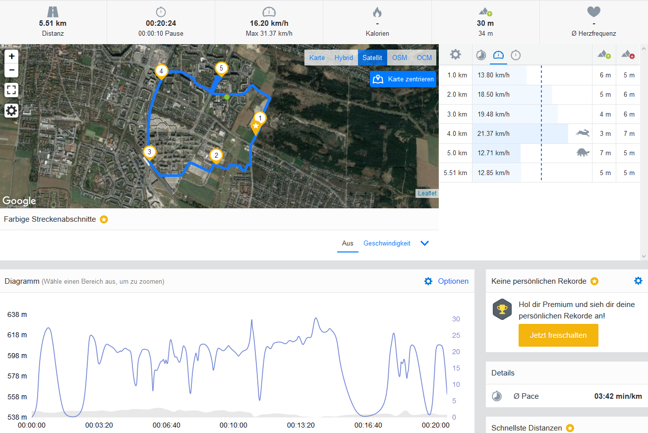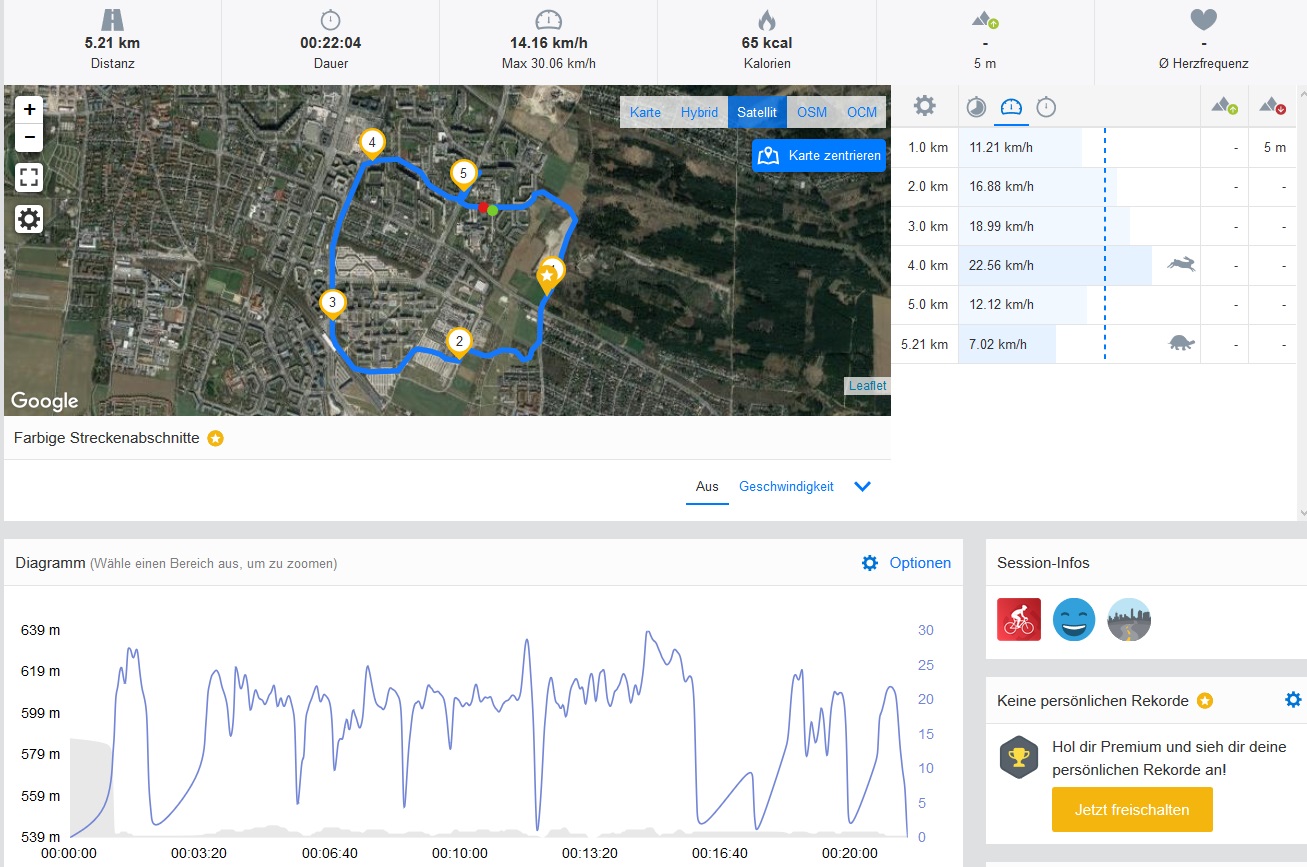 Auf unserer obligatorischen Fahrradtour vergleichen wir das GPS im Nokia 2.1 mit unserem Referenzgerät Garmin Edge 520. Der aufgezeichnete Streckenverlauf liegt dabei auf langen Geraden auf dem tatsächlichen Weg. Kurven werden aber teilweise über große Entfernungen abgekürzt. Mit langsamen Richtungswechseln kommt das Android-Smartphone besser zurecht als mit abrupten Änderungen bei höheren Geschwindigkeiten. Das Nokia 2.1 ist daher nur für einfache Navigationsaufgaben geeignet.
